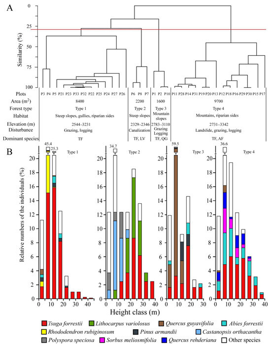 Floristic dissimilarity dendrogram for the 33 plots (A) and frequency distribution of height classes of woody species (height ≥ 1.3 m) of each forest type (B). Type 1: Tsuga forrestii evergreen coniferous forest; Type 2: Tsuga forrestii-Lithocarpus variolosus evergreen coniferous and broad-leaved mixed forest; Type 3: Tsuga forrestii-Quercus guyayifolia evergreen coniferous and broad-leaved mixed forest; Type 4: Tsuga forrestii-Abies forrestii evergreen coniferous forest. TF = Tsuga forrestii, LV = Lithocarpus variolosus, QG = Quercus guyayifolia, and AF = Abies forrestii.