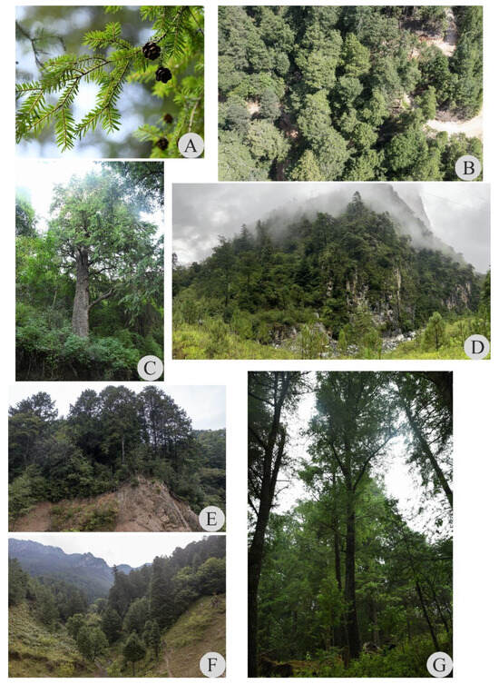 Tsuga forrestii and its representative forest stands and habitats are shown in Figure 4A–G.