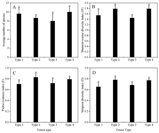 Among the four forest types, the average number of woody species, ranging from 8 to 10 (Figure 5A), as well as the Shannon–Wiener diversity index ranging from 1.4 to 1.8 (Figure 5B), Pielou evenness index (E) ranging from 0.7 to 0.8 (Figure 5C), Simpson diversity index ranging from 0.7 to 0.8 (Figure 5D), showed no statistically significant differences (p < 0.05).