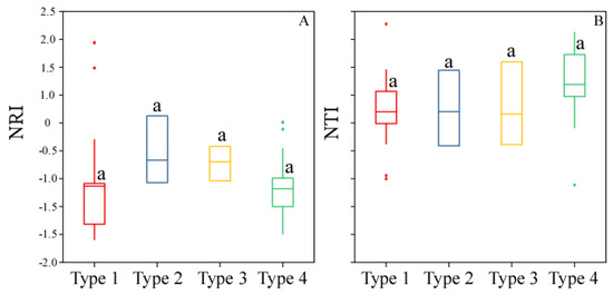 Phylogenetic metrics (NRI, NTI) of each forest type. (A) NRI (Net relatedness index) of each forest type; (B) NTI (Nearest taxon index) of each forest type. Type 1 = Tsuga forrestii evergreen coniferous forest; Type 2 = Tsuga forrestii-Lithocarpus variolosus evergreen coniferous and broad-leaved mixed forest; Type 3 = Tsuga forrestii-Quercus guyayifolia evergreen coniferous and broad-leaved mixed forest; Type 4 = Tsuga forrestii-Abies forrestii evergreen coniferous forest. Forests sharing the same letter do not differ significantly according to the non-parametric Kruskal–Wallis all-pairwise comparisons test (p < 0.05).