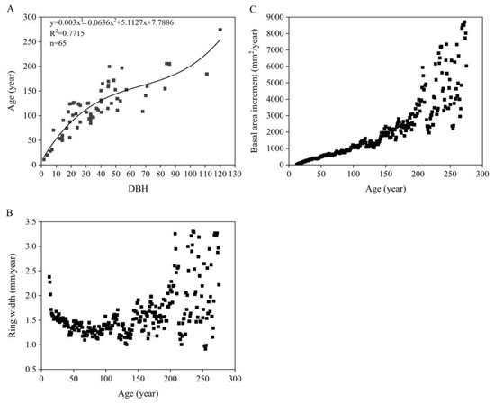 The relationship between DBH and age in Tsuga forrestii shows a strong positive correlation (y = 0.0003x3 − 0.0636x2 +5.1127x + 7.7886, R2 = 0.7715, n = 65, p < 0.05) (Figure 7A), allowing DBH to be used as an effective predictor of age for each Tsuga forrestii individual.