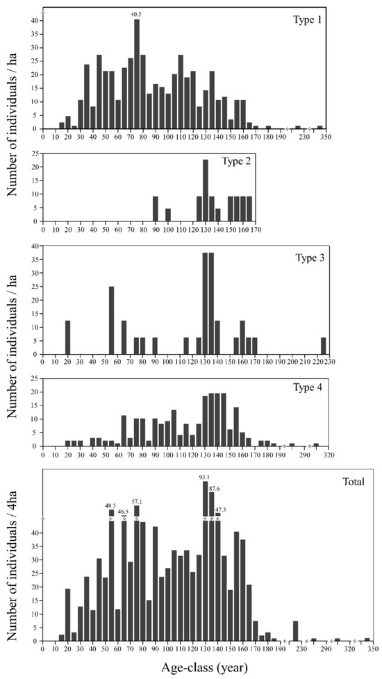 The estimated age structure of Tsuga forrestii (height ≥ 1.3 m) of each forest type.