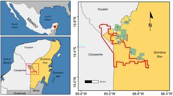 Location of the communities where questionnaires were applied in the municipality of José María Morelos, Quintana Roo, Mexico. The red polygon corresponds to the BKFFPA area, and green polygons with numbers correspond to the ejidos of the schools: (1) Othón P. Blanco, (2) La Candelaria, (3) Puerto Arturo, (4) Sabana San Francisco, (5) San Felipe, (6) San Isidro Poniente, (7) Venustiano Carranza.