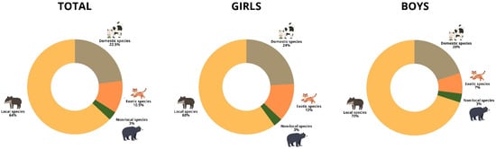 The percentage of each species category according to its geographical distribution (local or native, non-local, domestic and exotic) drawn by girls and boys in lower primary school. The total values represent the percentage of the most frequently drawn groups, regardless of gender.