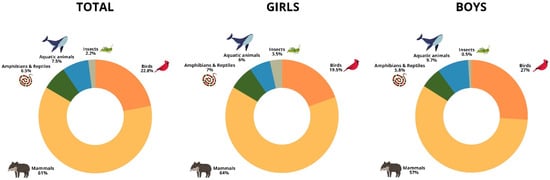 Percentage of animal groups drawn by girls and boys in lower primary school. The total values represent the percentage of the most frequently drawn groups, regardless of gender.