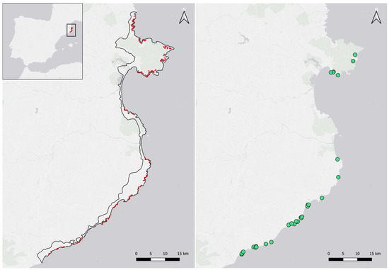 Left: Map of the Costa Brava (outlined in black) showing the distribution of over 1001 km transects (marked in red) designed for volunteer monitoring of alien flora within the LIFE medCLIFFS project. Right: Distribution of the locations of the 24 floristic novelties (marked in green).