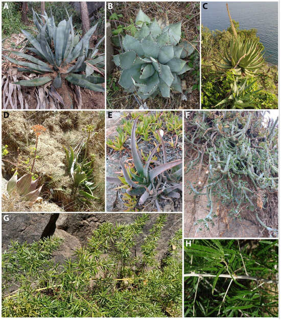 (A): Agave lurida, Santa Maria de Llorell. (B): Agave parryi, Sant Feliu de Guíxols. (C): Aloe glabra × A. speciosa, Sant Feliu de Guíxols. (D): Aloe striata, Lloret de Mar. (E): Aloe vera, S’Agaró. (F): Baculellum articulatum, Sant Feliu de Guíxols. (G): Asparagus aethiopicus, Blanes, Cala Sant Francesc. (H): Asparagus falcatus, Palamós. Pictures (A,B,E,F) by Jordi López-Pujol and (C,D,G,H) by C. Gómez-Bellver.