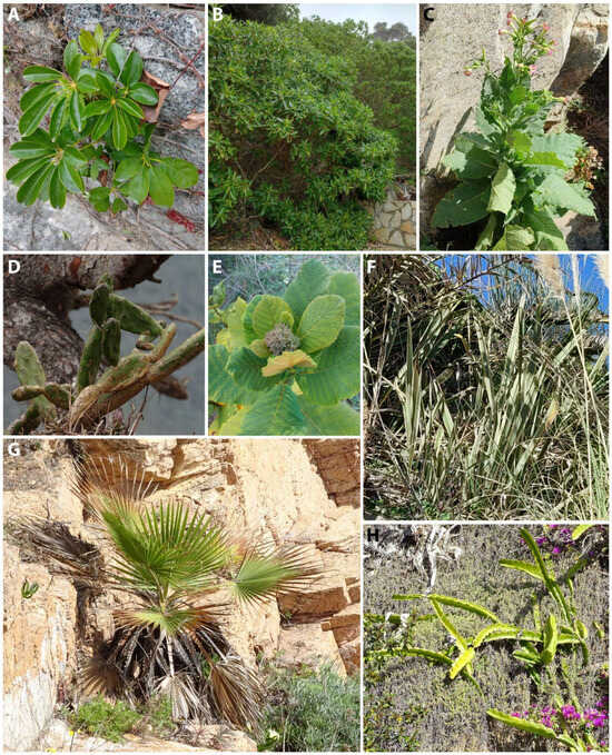 All observed taxa were either vouchered (particularly for the most accessible locations or those plants with not many difficulties to press) or extensively photographed (additional pictures are available upon request) to facilitate taxonomic identification. iNaturalist (https://www.inaturalist.org/) records were also created for at least one population of each species. Identification was based on the authors’ expertise, relevant floras, specialized monographs (e.g., Agaves of continental North America [17]), recent phylogenetic articles, and consultation with experts in certain taxa (e.g., Gideon F. Smith from Nelson Mandela University for Aloe). In addition, to ease identification we also observed the living specimens of several taxa included in the present work that are cultivated in the Botanical Garden of Barcelona (e.g., Agave parryi, Asparagus falcatus, Echium candicans, Furcraea selloana, Heptapleurum arboriccola, Myoporum laetum). The names of taxa have been updated according to Tropicos [18] and Plants of the World Online (POWO) [19]. The authorities of plant names follow the International Plant Names Index [20]. The names of families are based on the APG IV [21], with subfamilies indicated when relevant.