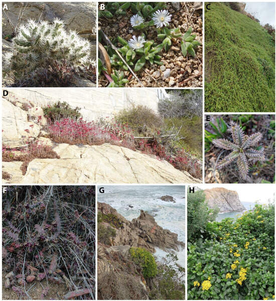 Blanes, Cala Sant Francesc, DG841142, 16 m, 18 February 2022, C. Gómez-Bellver, J. López-Pujol, N. Ibáñez & N. Nualart, vidi vivam, https://www.inaturalist.org/observations/262300966 (accessed on 19 February 2025) (Figure 2G). Lloret de Mar, Caleta d’en Trons. DG888164, 12 m, 24 February 2022, C. Gómez-Bellver, J. López-Pujol, J. Martínez-Fuentes & N. Nualart, vidi vivam. Roses, Cala de Canyelles Petites, EG160772, 6 m, 28 February 2022, C. Gómez-Bellver, J. López-Pujol & N. Ibáñez, vidi vivam. Sant Feliu de Guíxols, Puig de les Forques, EG033252, 15 m, 11 March 2022, C. Gómez-Bellver, J. López-Pujol & N. Nualart, vidi vivam. Castell Platja d’Aro, S’Agaró, Cala de Vaques, EG049269, 11 m, 11 March 2022, C. Gómez-Bellver, J. López-Pujol & N. Nualart, vidi vivam. In all these localities, only one or a few individuals were observed, having probably escaped from nearby gardens.