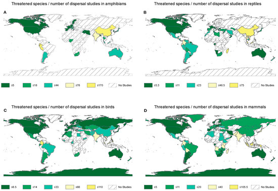 The number of red-listed animal species in each country relative to the number of dispersal studies. Dividing the number of threatened amphibian (A), reptile (B), avian (C), and mammal (D) species [26] by the number of dispersal studies reveals regions that are understudied relative to the number of threatened species. Across all vertebrate groups, countries in Asia, Africa, and South America appeared relatively understudied. Yellow colors represent a higher number of threatened species per study.