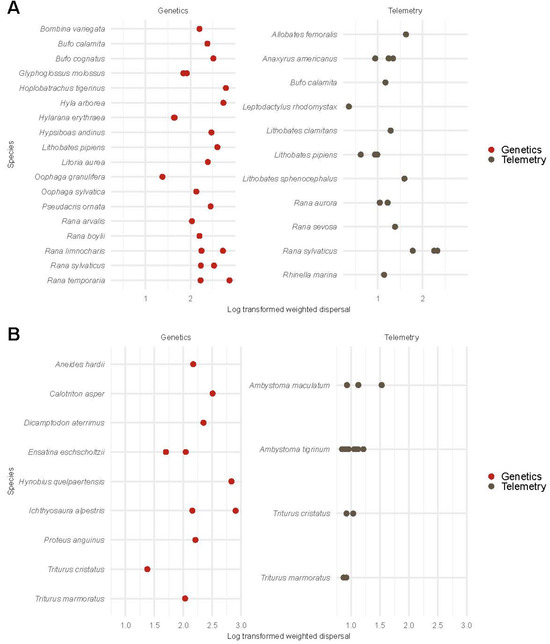 Log-transformed weighted dispersal estimates of anuran species (A) and urodele species (B) from telemetry and genetic studies. We display anuran and urodele species on the y-axis and log-transformed weighted dispersal on the x-axis. In anurans (i.e., frogs and toads), log-scale weighted dispersal estimates from telemetry studies (1.29 ± 0.50) and log-transformed weighted dispersal estimates from genetic studies (2.30 ± 0.38) were compared using a univariate regression model. The posterior probability of the weighted dispersal from genetic studies exceeding the weighted dispersal from telemetry studies was >95%. For urodeles (i.e., newts and salamanders), log-scale weighted dispersal estimates from telemetry studies (1.02 ± 0.17) and log-transformed weighted dispersal estimates from genetic studies (2.24 ± 0.43) were compared using a univariate regression model. The posterior probability of the weighted dispersal from genetic studies exceeding the weighted dispersal from telemetry studies was >95%.