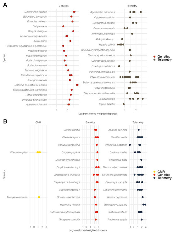Log-transformed weighted dispersal estimates of squamate species (A) and testudines (B) from demographic and genetic studies. We display squamates and testudines on the y-axis and log-transformed weighted dispersal on the x-axis. In squamates (i.e., snakes and lizards), log-scale weighted dispersal estimates from telemetry studies (1.40 ± 0.51) and log-transformed weighted dispersal estimates from genetic studies (2.03 ± 0.34) were compared using a univariate regression model. The posterior probability of the weighted dispersal from genetic studies exceeding the weighted dispersal from telemetry studies was >95%. For testudines (i.e., turtles and tortoises), log-scale weighted dispersal estimates from CMR studies (1.18 ± 0.25), telemetry studies (1.47 ± 0.60), and genetic studies (2.43 ± 0.37) were compared using a univariate regression model. The posterior probability of the weighted dispersal from genetic studies exceeding the weighted dispersal from telemetry and CMR studies was >95%. The posterior probability of the weighted dispersal from telemetry studies exceeding the weighted dispersal from CMR studies was 76%.