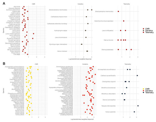 Log-transformed weighted dispersal estimates of Charadriiformes (A) and Passeriformes (B) from demographic and genetic studies. We display Charadriiformes and Passeriformes on the y-axis and log-transformed weighted dispersal on the x-axis. In Charadriiformes (e.g., shorebirds and seabirds), log-scale weighted dispersal estimates from CMR (0.60 ± 0.31), telemetry (1.14 ± 0.51), and genetic studies (2.32 ± 0.36) were compared using a univariate regression model. The posterior probability of the weighted dispersal from genetic studies exceeding the weighted dispersal from CMR and telemetry studies was >95%. Similarly, the posterior probability of the weighted dispersal from telemetry studies exceeding that from CMR studies was 95%. For passerines (e.g., sparrows and finches), log-scale weighted dispersal estimates from CMR studies (0.56 ± 0.32), telemetry studies (1.71 ± 0.74), and genetic studies (2.40 ± 0.42) were compared using a univariate regression model. The posterior probability of the weighted dispersal from genetic studies exceeding the weighted dispersal from telemetry and CMR studies was >95%. Similarly, the posterior probability of the weighted dispersal from telemetry studies exceeding that from CMR studies was >95%.