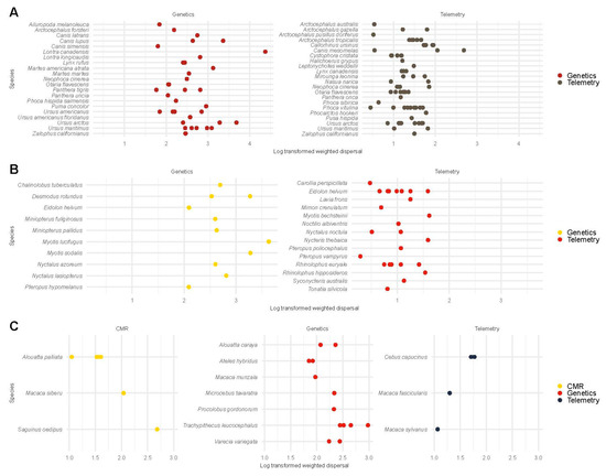 Log-transformed weighted dispersal estimates of Carnivora (A), Chiroptera (B), and primates (C) from demographic and genetic studies. We display carnivores, bats, and primates on the y-axis and log-transformed weighted dispersal on the x-axis. In carnivores (e.g., seals, bears, and wolves), log-scale weighted dispersal estimates from telemetry (1.36 ± 0.40) and genetic studies (2.77 ± 0.62) were compared using a univariate regression model. The posterior probability of the weighted dispersal from genetic studies exceeding the weighted dispersal from CMR and telemetry studies was >95%. For chiropterans (i.e., bats), log-scale weighted dispersal estimates from telemetry studies (1.01 ± 0.36) and genetic studies (2.75 ± 0.52) were compared using a univariate regression model. The posterior probability of the weighted dispersal from genetic studies exceeding the weighted dispersal from telemetry and CMR studies was >95%. For primates, (e.g., lemurs and monkeys), log-scale weighted dispersal estimates from CMR (1.74 ± 0.56), telemetry (1.46 ± 0.33), and genetic studies (2.31 ± 0.31) were compared using a univariate regression model. The posterior probability of the weighted dispersal exceeding that from telemetry and CMR studies was 99% and 85% respectively. The posterior probability of the weighted dispersal from CMR studies exceeding that from telemetry studies was 95%.