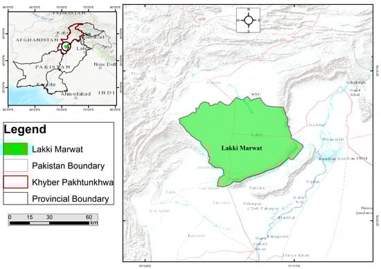 This study was carried out across the rural communities of District Lakki Marwat in the southern regions of Khyber Pakhtunkhwa (Figure 1). This district has an area of 3164 km2 and a total of 131,800 households. It has a population of 1,040,856, resulting in a population density of approximately 329 individuals per square kilometer. The district’s predominantly rural population relies on agriculture and livestock, producing crops like wheat, maize, peanuts, and chickpeas, along with cash crops such as melons and vegetables, with potential for growth through improved irrigation [].