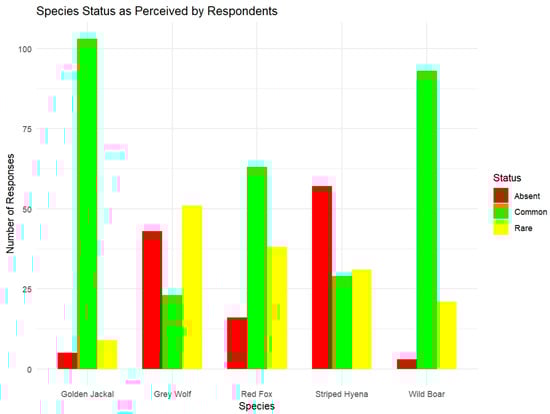 The analysis evaluated community perceptions of species’ statuses (common, rare, and absent) across five species: wild boar, striped hyena, grey wolf, golden jackal, and red fox (Figure 2). Descriptive statistics revealed significant variation in the frequency of responses across categories. Wild boars and golden jackals were most frequently reported as “common,” with 93 and 103 responses, respectively. In contrast, grey wolves and striped hyenas received higher “absent” responses (43 and 57, respectively), reflecting a general perception of lower prevalence in the study area. The “rare” status showed moderate frequency for most species, with grey wolves receiving the highest (51 responses).