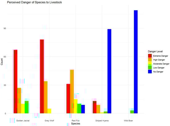 Perceived danger levels of wildlife species to livestock were categorized into five levels: extreme danger, high danger, moderate danger, low danger, and no danger. The graph illustrates the frequency of responses for each species, highlighting the grey wolf and golden jackal as perceived to pose extreme danger.