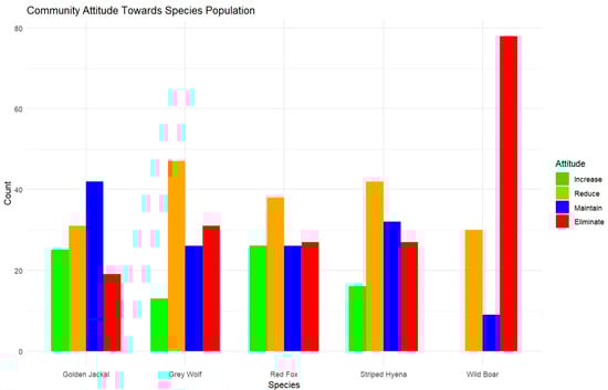 This study examined community attitudes regarding five species and revealed that the highest count for “eliminate (eliminate the entire population of the species from the area)” was recorded for wild boar (78 responses), while “maintain” attitudes were most frequent for golden jackal (42 responses) (Figure 5, Supplementary Materials, Table S6). Attitudes toward population “increase” remained low across all species, with the highest being for golden jackal (25 responses).
