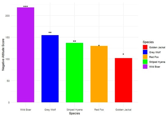Negative attitudes (sum of reduced and eliminated scores) toward species, based on the sum of individual ratings (ranging from 1 to 4 per respondent). The total negative score for each species reflects the aggregate of respondent attitude, with the higher scores indicating more negative views. Statistical significance is marked above the bars with asterisks. *** (p < 0.001): very highly significant; ** (p < 0.01): highly significant; and * (p < 0.05): significant.