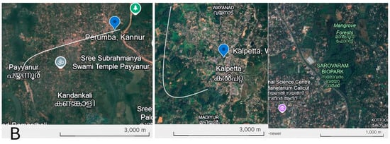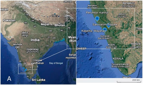 (A) Google Earth images displaying a map of India, showing the study sites within the state of Kerala; (B) the highlighted sites encompass the roadside tree and orchid survey areas in Perumba, Kannur district, and Kalpetta, Wayanad district. Furthermore, the final enhanced image shows Sarovaram Biopark, an urban biological park located in Kozhikode, where the rescued orchids have been planted.