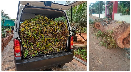 Orchids that were going to be removed or destroyed from roadside trees were collected from the northern Kerala districts of Kozhikode, Kannur, Kasargod, and Wayanad. In addition, orchids from tea and coffee plantations were collected from Wayanad. The orchids from the roadside trees were either collected immediately after the trees were removed or when the trees were earmarked for removal shortly afterward. This was accomplished by coordination with local authorities and highway contractors. With the consent of the landowners, orchids were also collected from tea and coffee plantations in Vythiri, Meppadi, and Chundale, which are all located in the Wayanad district, prior to the plantation owners removing the orchids from the host plants.
