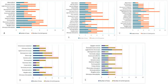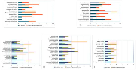 The diversity of tree species found along the five-kilometer stretch of road in Kannur, segmented into one-kilometer sections: (A) (1st kilometer), (B) (2nd kilometer), (C) (3rd kilometer), (D) (4th kilometer), and (E) (5th kilometer), along with the number of orchid species that each tree species supports.