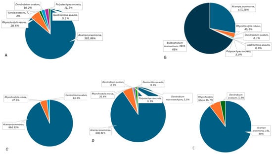 The diversity of roadside trees in the district of Kannur is notably high, with over 50% of the trees being native to the Western Ghats region. The most abundant tree species are non-native trees such as Artocarpus heterophyllus (jackfruit), Mangifera indica (mango), Tectona grandis (teak), and Swietenia mahogany (mahogany) (Figure 6A–E), due to the presence of human settlements along the road. Along a five-kilometer stretch, 18 tree species have been identified as hosts for orchids. Variations in tree and orchid diversity are observed across individual one-kilometer sections, as illustrated in Figure 6A–E and Figure 7A–E. The highest tree density was recorded in the third km, with 34 trees, while the lowest was in the 5th km, with 18 trees (Figure 6C,E). As shown in Figure 6A,B,D, Terminalia bellirica hosts five species, while A. heterophyllus, M. indica, P. marsupium, and F. religiosa are among the trees hosting the highest number of orchid individuals and species. Conversely, species such as Acacia auriculiformis, Acacia mangium, Cassia fistula, Bombax ceiba, and Wrightia tinctoria exhibit no or sporadically low epiphytic orchid colonization. In the study area, the species of orchid that is most abundant is Acampe praemorsa (Figure 7A–E). The endemic orchid, Bulbophyllum rosmarianum, is exclusively found on the Indian Banyan tree (Ficus benghalensis), recorded only on one tree, where it forms dense clusters. Among the trees, Mangifera indica (mango tree) and Artocarpus heterophyllus (jackfruit tree) were the dominant tree populations, supporting large populations of orchids, mainly Acampe praemorsa, followed by B. rosmarianum and Polystachya concreta (Figure 6A–E and Figure 7A–E). In Kannur, A. praemorsa emerged as the dominant species in terms of population density, followed by B. rosmarianum and Polystachya concreta. The charismatic Rhynchostylis retusa (fox-tail orchid) was observed in the form of individual plants. Most other orchid species were rare, appearing sporadically on select trees (Figure 6A–E and Figure 7A–E).