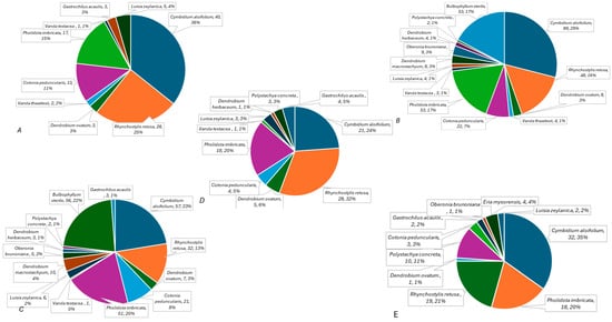 The cool-growing orchids Aerides crispa, Flickingeria nodosa, Gastrochilus acaulis, Vanda thwaitesii, and Vanda wightii, were found at 700 masl. Of these, Vanda thwaitesii and Aerides crispa are extremely rare in their distribution, being located solely in the northern region of Wayanad and contiguous with the Coorg district of the Karnataka state. Dendrobium ovatum, a species endemic to the Western Ghats, was found on four tree species, including the locally endemic Pterocarpus marsupium and Stereospermum colais. Luisia zeylanica, a native Indian orchid with a very limited distribution in Nepal and Sri Lanka, was exclusively found on Terminalia bellirica. Eria mysorensis, another orchid endemic to the southern Western Ghats, has been recorded on Terminalia travancorensis, a tree species also endemic to the southern Western Ghats and Sri Lanka. Another southern Western Ghats endemic species, Dendrobium barbatulum, is found only on the endemic tree Stereospermum colais. A. heterophyllus (jackfruit tree) hosted the greatest number of individual orchids, followed by M. indica (mango tree) and the endemic Terminalia bellirica. Cymbidium aloifolium, followed by Pholidita imbricata and Rhynchostylis retusa, were the dominant populations on roadside trees (Figure 9A–E).