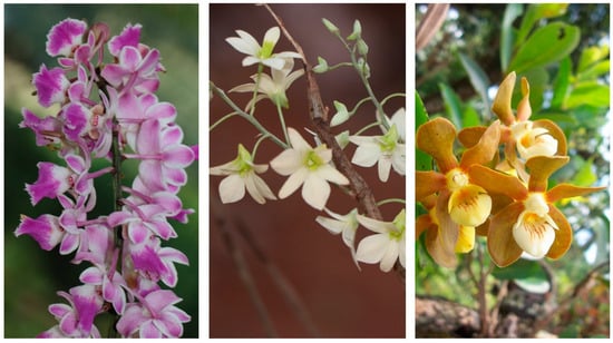 - Schuiteman, A.; Kailash, B.; Shrestha, U.B. A Checklist of the Orchidaceae of India André Schuiteman, Uttam Babu Shrestha. In Monographs in Systematic Botany from the Missouri Botanical Garden; The University of Chicago Press: Chicago, CA, USA, 2021; pp. 1–264. [Google Scholar]