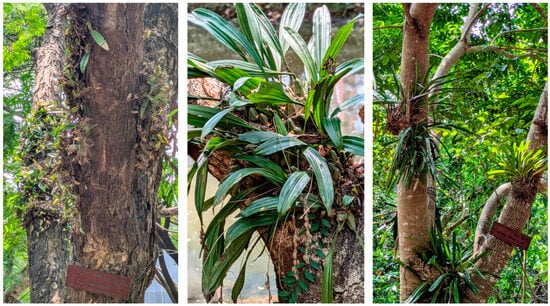 Orchids are prone to population decline, due to habitat fragmentation, climate change, reliance on unique pollinators, and mycorrhizal fungi [,,,,]. In global biodiversity hotspots and other countries with rich orchid diversity, habitat loss, and other anthropogenic factors contribute to population decline [,,,,,]. The conservation of orchids in a changing climate using in situ and ex situ systems is generally feasible, but most of the time, these efforts are challenging, time-consuming, and fraught with low recovery rates [,,,]. Mysteriously, orchids are found to be successful colonizers on urban trees [,], plantations [,,], and other areas where they are least expected to exist. India hosts 51 species of native trees, of which 86% fall into the IUCN category of Vulnerable. Ten percent of Indian native trees are located in urban areas []. However, this percentage might be considerably higher in Kerala, although the available data is inconsistent. These populations of native trees and orchids are more under threat from removal/destruction. The utilization of non-natural landscapes, such as urban areas, to host native orchids [] presents numerous benefits. This approach not only enhances landscapes but also fosters a connection between people and nature.