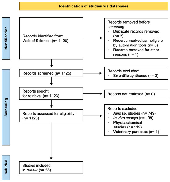 This evidence synthesis was conducted as per the Preferred Reporting Items for Systematic Reviews and Meta-Analyses (PRISMA) protocol [35]. The scientific articles published between 2000 and 2024 were identified by searching all databases of the Clarivate Web of Science platform licensed to Universidad Veracruzana. The 24-year search window was according to the period defined by the WoS license terms granted to the Universidad Veracruzana. We used the WoS database because most of its publications have undergone a rigorous peer-review process and are one of the most well-regarded academic databases for systematic reviews [36]. We established common search terms in the title and specific terms in the topic. The search string for the title was TI = (“stingless bee*” AND honey* OR propolis) (Appendix A), while the topic search was based on the 2023 list of the top 20 morbidities reported by the Ministry of Health in Mexico [37] (Appendix A). We also included cancer as an increasing morbidity and mortality cause [29]. The search engine Google Scholar was not employed because it tends to omit literature [38] and has low levels of reproducibility [39], and neither was the Scopus database because the license was recently acquired (2025) by the Universidad Veracruzana.
