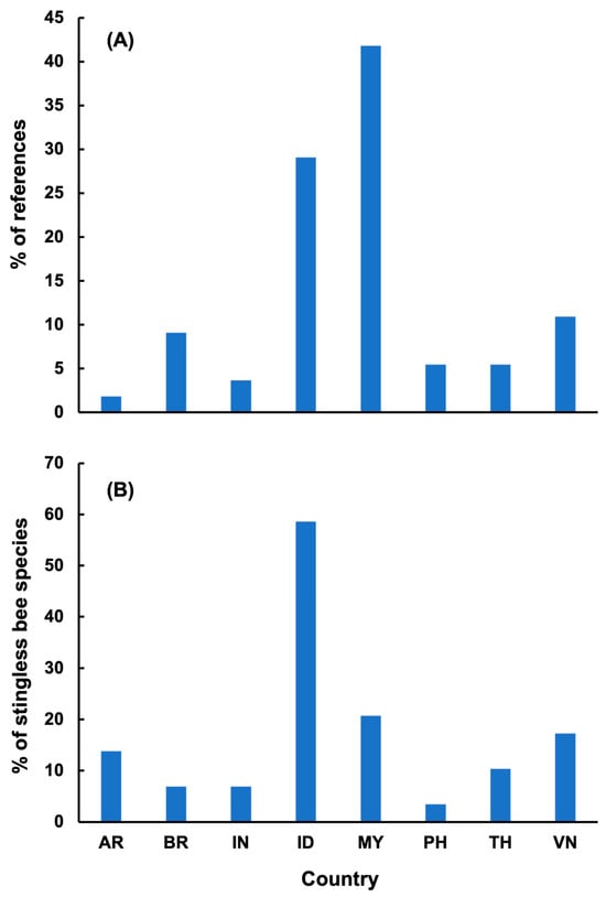 The proportion of selected studies (A) and stingless bee species (B) by country. Country names adhere to ISO standard abbreviations: Argentina = AR, Brazil = BR, India = IN, Indonesia = ID, Malaysia = MY, Philippines = PH, Thailand = TH, Vietnam = VN.