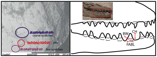 - Massare, J.A. Tooth morphology and prey preference of Mesozoic marine reptiles. J. Vertebr. Paléontol. 1987, 7, 121–137. [Google Scholar] [CrossRef]