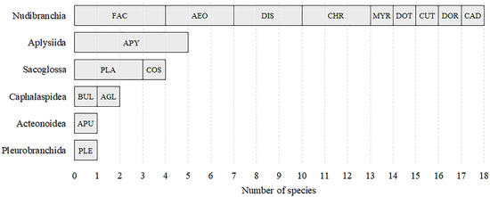 Number of species per family within higher taxa, combined for all sampling localities on the Caribbean and Pacific coasts of Colombia. FAC = Facelinidae, AEO = Aeoliididae, DIS = Discodorididae, CHR = Chromodorididae, MYR = Myrrhinidae, DOT = Dotidae, CUT = Cuthonidae, DOR = Dorididae, CAD = Cadlinidae, APY = Aplysiidae, PLA = Plakobranchidae, COS = Costasiellidae, BUL = Bullidae, AGL = Aglajidae, APU = Aplustridae, PLE = Pleurobranchidae.
