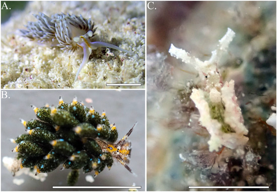 - Carmona, L.; Bhave, V.; Salunkhe, R.; Pola, M.; Gosliner, T.M.; Cervera, J.L. Systematic Review of Anteaeolidiella (Mollusca, Nudibranchia, Aeolidiidae) Based on Morphological and Molecular Data, with a Description of Three New Species. Zool. J. Linn. Soc. 2014, 171, 108–132. [Google Scholar] [CrossRef]
