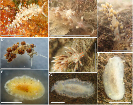 New records for the Colombian Pacific. National Natural Park Uramba Bahía Málaga: (A). Anteaeolidiella ireneae, (B). Phidiana sp., (C). Emarcusia cf. morroensis, (D). Doto sp., (E). Cuthona sp., (F). Taringa cf. aivica, (G). Tyrinna evelinae, (H). Cadlina sp. Scale bars: (A,B,D,E). 2 mm, (C,F,H). 1 mm, (G). 5 mm.