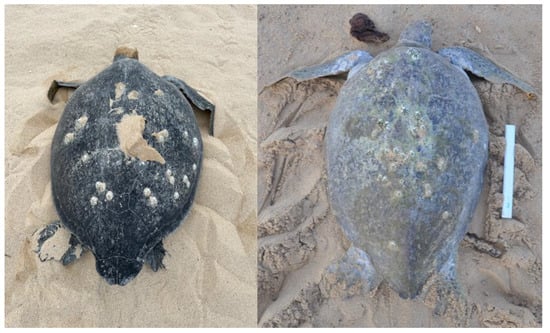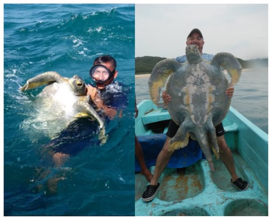 Males were captured at sea in front of Colola Beach during the copulation and courtship process, which takes place near the shore of the beach (10–60 m). The males were captured by the “swim-up” technique, which consists of approaching the males and females during mating, utilizing a boat with an outboard motor at a distance of about 30 m; then, swimming stealthily towards them to capture the male. Once captured, the turtle was loaded onto the boat to record its morphometric measurements (Figure 2).