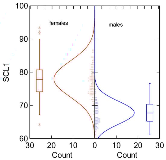 The size of nesting females and breeding males was statistically different (SCL) (Student’s t-test, t = −14.837, p = 0.000, and Bonferroni adjusted prob = 0.000) (Figure 3).