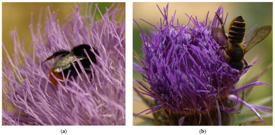 One of the reasons for the global decline in wild bees is the insufficiency of food plants that provide pollen and/or nectar [1,2,3,4,5]. The intensive agriculture contributes considerably to this deficit [6]. The vast agricultural blocks leave no strips of entomophilous flowering plants in-between. Additionally, the farmers kill the bees’ food plants with herbicides. For example, the lavender plantations in the agricultural land in Dobruja (SE Bulgaria) are found to have very little activity and diversity of wild bees. At the same time, the ornamental plantation in the Rusalka resort, which is close to Natura 2000 steppe habitats, is characterized with a high activity and diversity of wild bees [7]. Also, in Bulgaria, in the last decade, land use has often changed from meadows to intensive agriculture. In recent years, on the Balkans, a new hazard has emerged for the floral food resources. It might turn into the next threatening factor for wild bees’ decline. Vast photovoltaic power stations (solar parks of many hectares) replace wild ecosystems, such as shrub and grasslands. The owners tend to “kill the grass” beneath the panels (using herbicides or other methods) in order to avoid the necessity of mowing [personal communication with photovoltaic power station owners]. This equals to a loss of flowering food resources. However, solar parks, managed as wildflower meadows, provide bumble bees with foraging and nesting opportunities [8]. Another hazard, related to the flowering food resources loss, is the change in the landscape. In Bulgaria, for the period of 2007–2017, a decline in livestock production was reported by more than 20% [9]. This is a significant issue concerning semi-artificial open habitats, such as pastures and meadows. In mountainous and low-mountainous regions, these habitats are often abandoned. The consequence is thriving of shrubs followed by gradual afforestation [10,11]. Where maintenance is practiced, it frequently involves intensive techniques aimed at the deliberate removal of shrubs and certain herbaceous species through mechanical treatments and pesticides and/or the enhancement in economically valuable species through fertilization. Intensive maintenance increases the economic value of pastures and meadows [11]. However, these practices simultaneously lead to a significant reduction in the biological diversity and habitats’ sustainability.