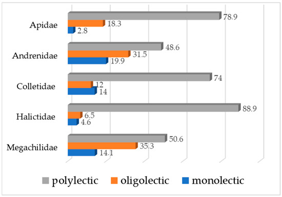 - Bogusch, P.; Bláhová, E.; Horák, J. Pollen specialists are more endangered than non-specialised bees even though they collect pollen on flowers of non-endangered plants. Arthropod-Plant Interact. 2020, 14, 759–769. [Google Scholar] [CrossRef]
