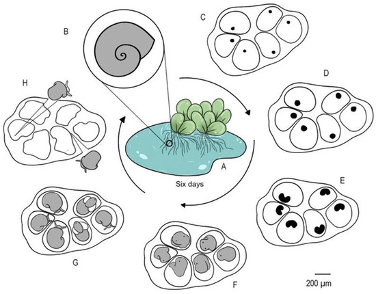 Schematic representation of the cycle presented for specimens of Biomphalaria found in Mapiri Lake in Santarém, PA, and the main stages of development observed in the laboratory. Aquatic environment and macrophyte locations (A); adult specimen of Biomphalaria (B); egg mass in blastula (C) on the first day of the cycle; gastrula (D) after 24 h; trochophore (E) on the fourth day of the cycle; veliger (F) on the fifth day of the cycle; hippo (G) on the sixth day of the cycle; adult organism of post-hatch Biomphalaria molluscs (H).