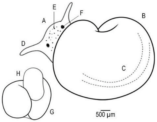 Aspects of the newborn mollusk. Head (A); shell (B); renal tube (C); tentacles (D); pigments (E); eyes (F); shell opening (G); foot (H).