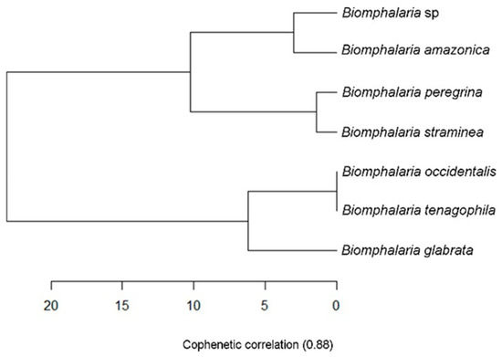 The laboratory-hatched specimens that were closer to adult age, which were used for morphological identification, had a small brown shell about 5 mm (±0.60 mm) in diameter and 2.5 mm in width (±0.30 mm), with 5 spirals that rapidly grew in diameter (the central spiral to the left) and a rounded edge. Compared to other species of Biomphalaria, shell measurements of diameter, width, and number of spirals were similar to B. amazonica [7], which was corroborated by the cluster analysis, with a cophenetic correlation of 0.88 (Figure 5).