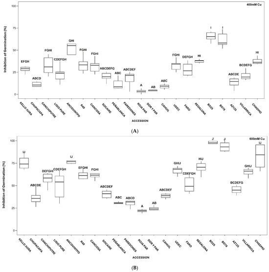 Inhibition of Germination (IG) increased with the Cu concentration (Table S3). Significant differences in IG values among accessions are shown in Figure 1A (at 400 mM Cu), Figure 1B (at 600 mM Cu), and Figure 1C (at 800 mM Cu).