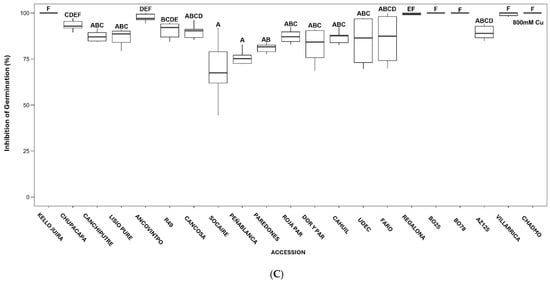 Boxplot of effects of 400 mM (A), 600 mM (B), and 800 mM CuSO4·5H2O (C) on Inhibition of Germination (%) of quinoa accessions. Different letters denote significant differences among accessions.