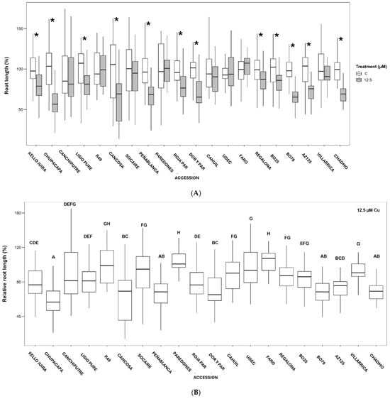 Boxplot of effects of Cu treatments on radicle length (A) and relative root length (B) of quinoa seedlings (C, length in nutrient solution in the absence of supplemented Cu; 12.5, length in nutrient solution supplemented with 12.5 µM of CuSO4·5H2O). Asterisks indicate significant statistical differences between C and 12.5 µM treatments for each accession (A). Different letters denote significant differences between accessions (B).