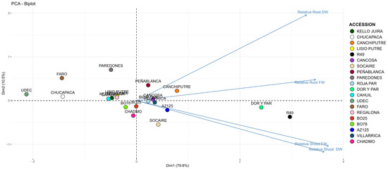 Analysis of relative growth parameters (RRFW, RRDW, RSFW, RSDW) revealed significant differences among accessions (Table 1). The highest relative values were observed in R49 and Dorado Paredones, whereas Chucapaca, UdeC9, and Faro exhibited the lowest (Table 1).