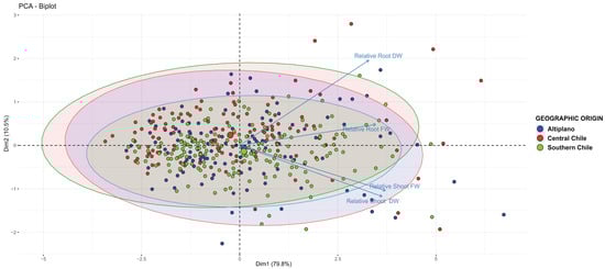 To test if accessions had a correlation with its geographical origin (Altiplano, Central Chile and Southern Chile), another PCA was conducted only with Chilean accessions. A PERMANOVA test was performed with the geographical origin as a fixed factor, and a post hoc pairwise comparison test (RVAideMemoire R package v. 0.9-83-7) was performed.