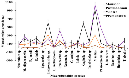 | 36 | Nemalycastis indica Southern, 1921 | 1 ± 1 b | 0 ± 0 b | 2 ± 1 a | 0 ± 0 b |
