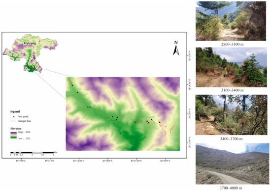 Sample lines, netting points, and habitat information at different altitudes in the Gyirong Valley.